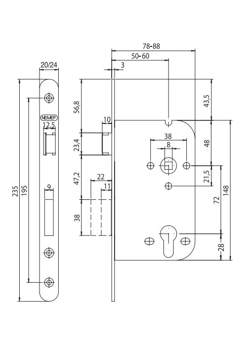 Замок врізний NEMEF 1-WAY DIN 349/36 CR UNIV