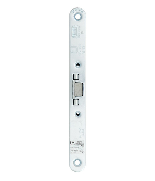 Основний універсальний замок NEMEF 1739/46 для протипожежних та вхідних сталевих дверей з функцією антипаніки і розділеним штоком. Всі деталі замку сталеві. У відкритому стані замок відмикається натисканням на ручку з будь-якої сторони дверей. У закритому стані з обох сторін ручка має вільний хід (натискається, але замок не відкривається). Ключем замок відкривається з будь-якої сторони дверей завжди. Сертифікований згідно DIN 18273 і EN 179.
