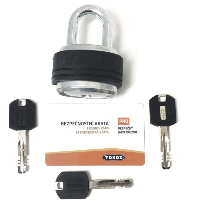 Висячий замок компактних розмірів (81 * 58 * 42 мм). Закривається дужкою із загартованої сталі (діаметр дужки 9мм). Нижня частина замку також виготовлена із загартованої сталі для ускладнення висвердлювання і випилювання циліндра. Високосекретний дисковий циліндр стійкий до забруднення та вологи. Можливе об'єднання в майстер-системи з іншими замками серії TOKOZ PRO.