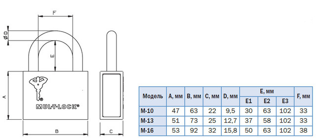 Навісний замок MUL-T-LOCK М10 підвищеної безпеки. Застосовується для забезпечення максимальної безпеки замикання контейнерів, гаражів, товарних вагонів поїздів, складів і т. д. Матеріал: замок-загартована сталь, дужка-загартована сталь із вмістом бору. Циліндр MUL-T-LOCK Classic. Ключ виймається тільки в закритому стані.